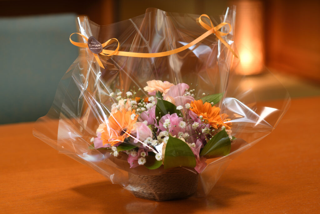 花束と花カゴどちらかお選びいただけます。